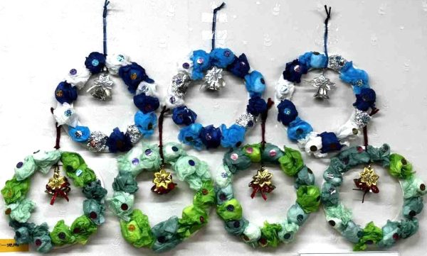 パンダ組(二歳児クラス)はクリスマスツリーとリースをつくりました😊 ツリーは折り紙を三角に折るところからスタート。 みんながサンタさんとトナカイさんになって笑顔で完成です。 リースはお花紙を上手に丸めて丁寧につくることができました😊