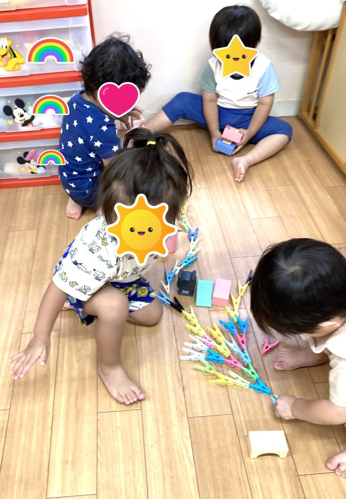 子供たちにとっては、周りにある物すべてが遊び道具になります。 今日は、洗濯ばさみで遊んでみました。 しっかり掴んではさんでね。 きれいな形にたくさん並べたね。