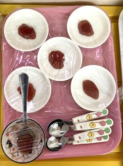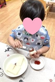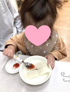 スプーンを使って上手にぬりぬりして美味しいイチゴサンドのおやつが完成しました。
